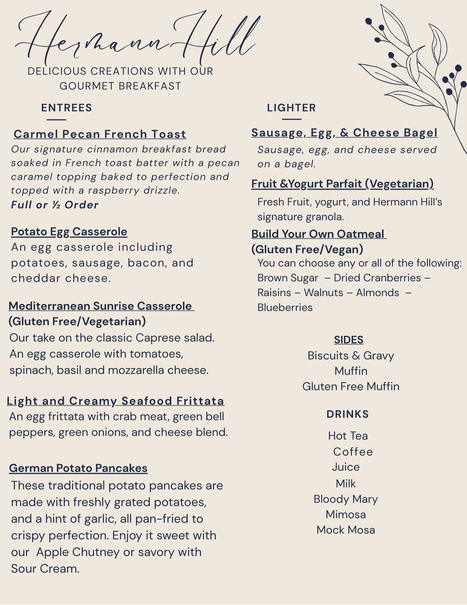 Wake up to the aroma of chef-crafted gourmet breakfasts, featuring indulgent signatures like caramel pecan French toast, vibrant Mediterranean-inspired casseroles, and lighter creations made with fresh, local ingredients. Every morning at Hermann Hill is designed to feel unrushed, delicious, and thoughtfully prepared just for you.
